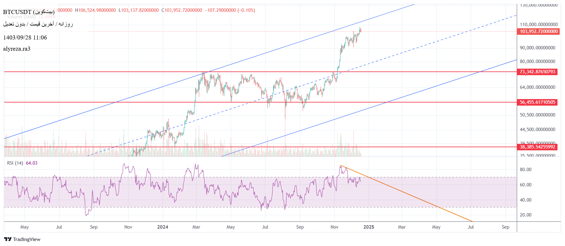 بیت کوین در محدوده 105 هزار دلار RSI نزولی دارد. در همین محدوده میتوان وارد معامله فروش شد.